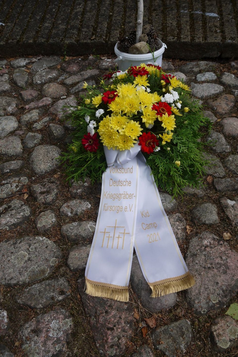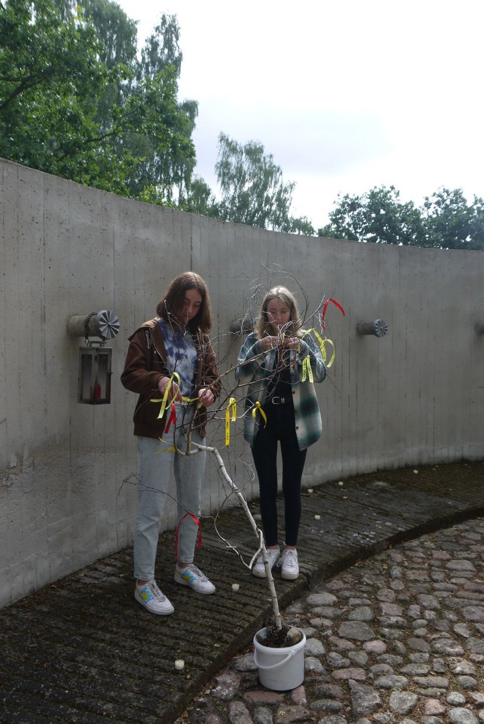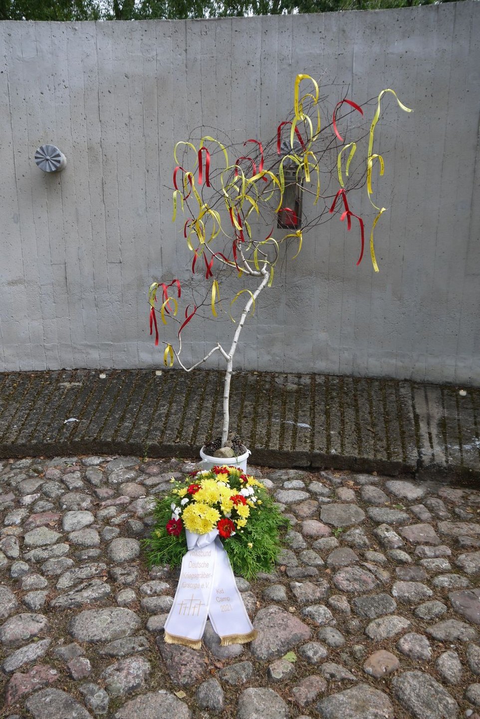 Zum Schluss der Gedenkfeier schmückten die Teilnehmenden eine junge Birke mit Bändern, die die Namen der Gefallenen der Kriegsgräberstätte trugen.