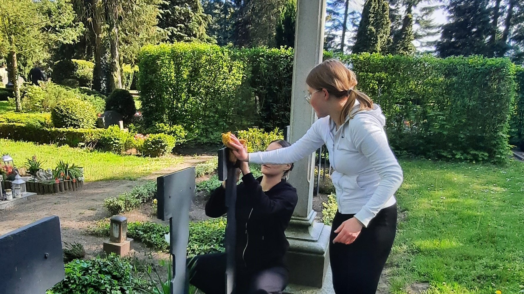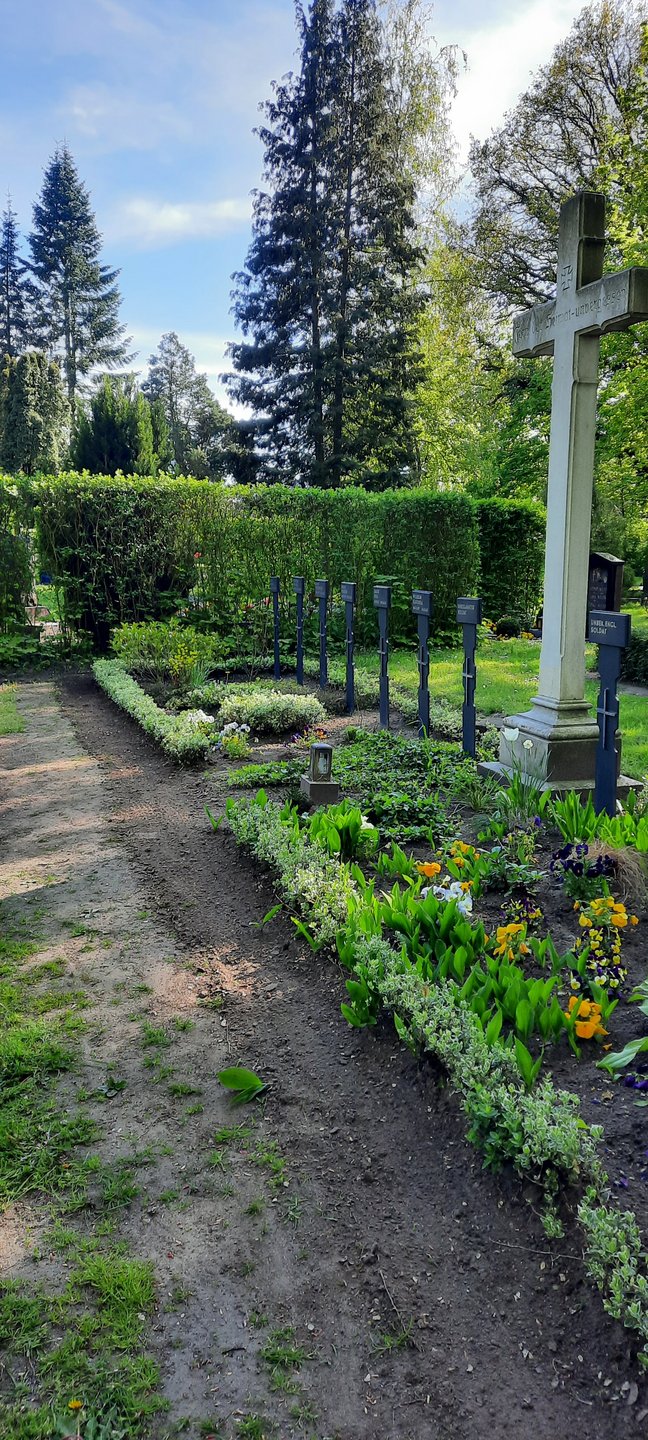 Schülerinnen und Schüler der 11. Klasse des Gymnasialen Schulzentrums Wittenburg pflegen unter dem Motto „Gemeinsam für den Frieden“ am 8. Mai 2023 die Kriegsgräber des Zweiten Weltkrieges auf dem Friedhof der Evangelisch-Lutherischen Kirchgemeinde Wittenburg.