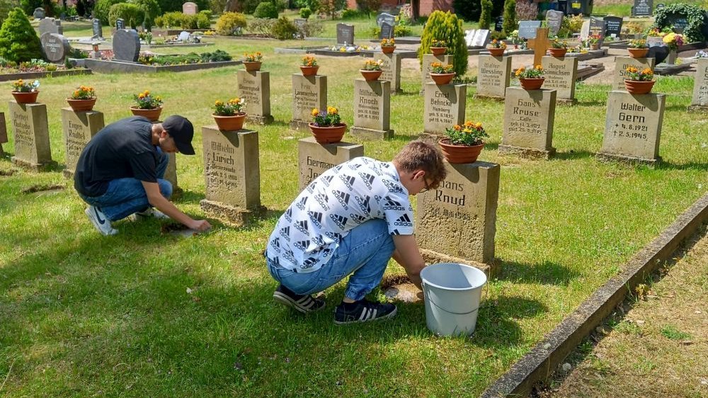 Bei sonnigem Wetter pflegten am 11. Mai 2023 fünf Schülerinnen und Schüler des Wahlpflichtkurses Regionalgeschichte/Kriegsgräberfürsorge des Schulzentrums „Fritz Reuter“ Dömitz die Kriegsgräber auf dem Stadtfriedhof.